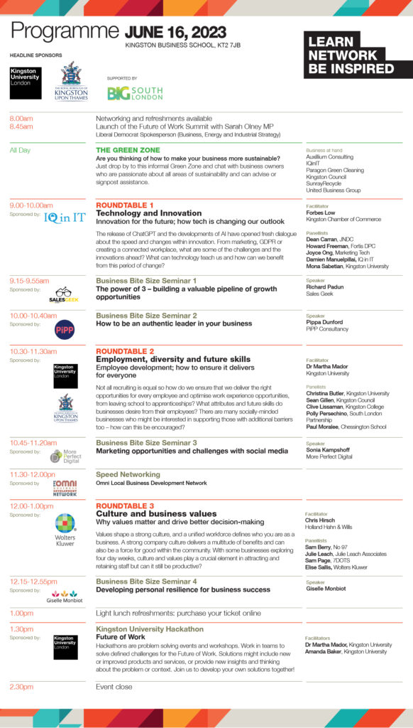 I am very excited that I will speak at the Future of Work summit organised by the Kingston Chamber of Commerce, held on Friday 16th June 2023 at the Kingston Business School.